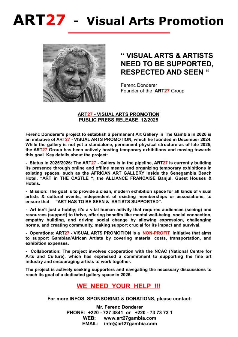 In a major boost to The Gambia’s growing creative sector, Ferenc Donderer, founder of ART27 – Visual Arts Promotion, has announced plans to establish a permanent art gallery in the country by 2026, a move set to provide a long-overdue dedicated space for Gambian and African visual artists to exhibit their work.